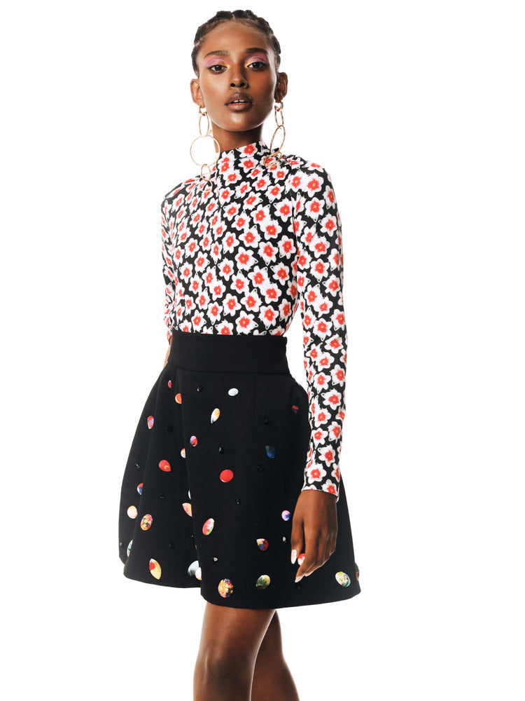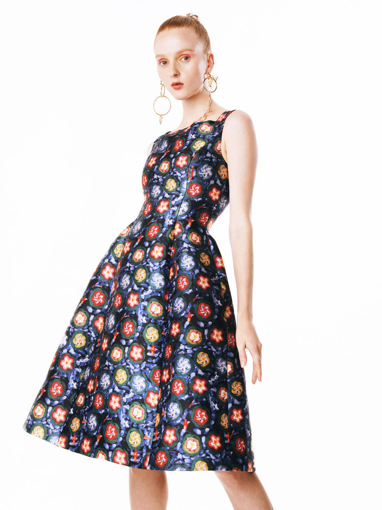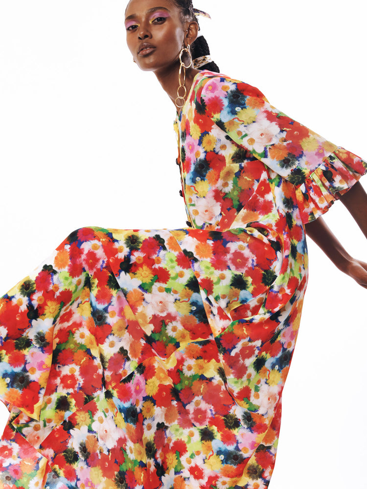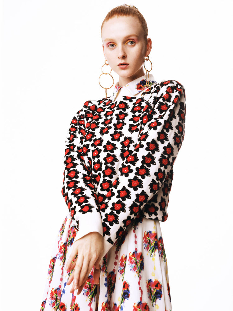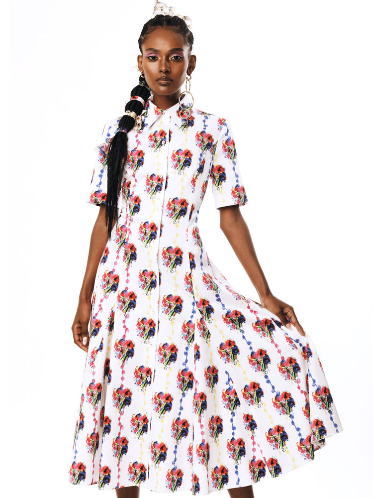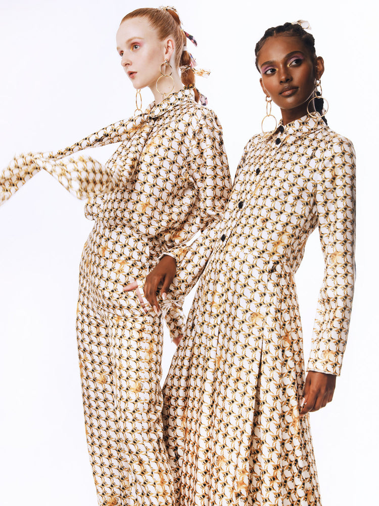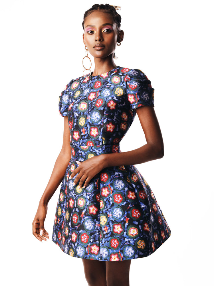 Perennially the anchor of my collections, floral prints took on a new dimension for Spring 2022. Influenced  by the saturated hues of the Hanging Gardens of Babylon and the enchanting habitat of the koi pond at the Brooklyn Botanical Gardens, I wanted to capture the depth and diversity of life that exists beyond surface blooms. A Bug’s Life is a print developed on this premise, depicting vibrant flowers enriched with ladybugs and caterpillars crawling through them. The koi pond motif is expressed through an intense jacquard woven into a dress, a top and skirt. What appears to be a houndstooth print at first glance is actually bumblebees set against a honeycomb pattern.