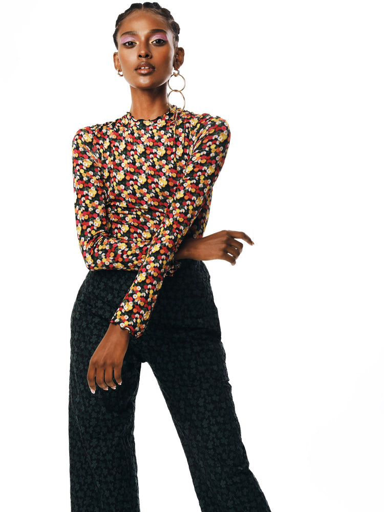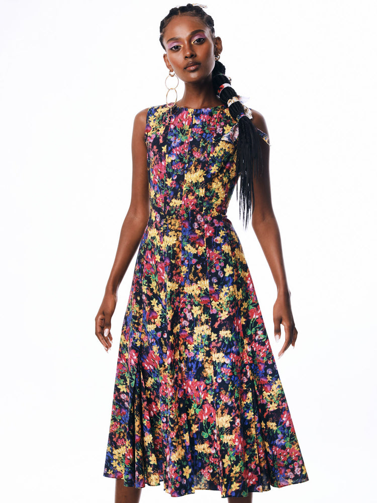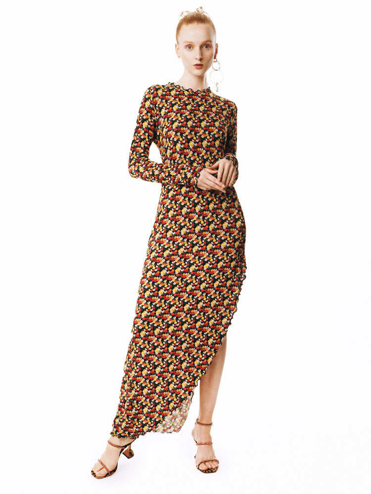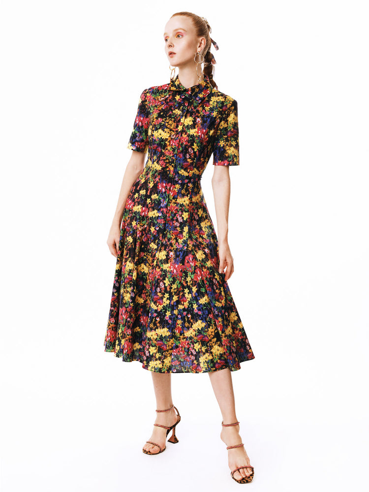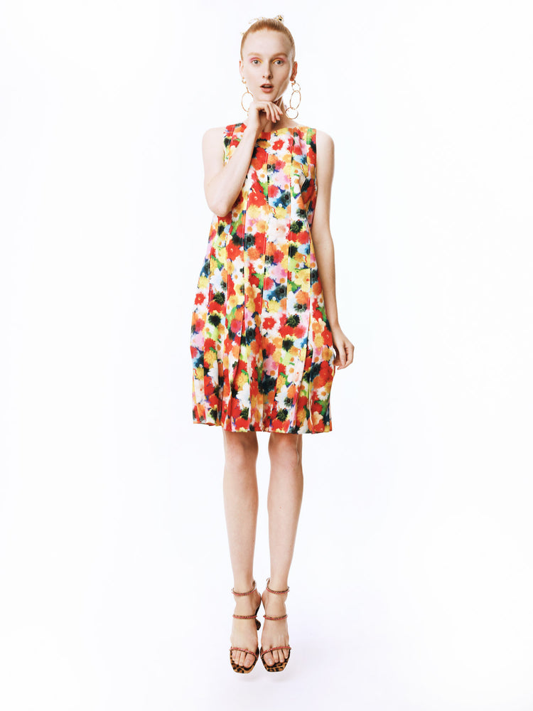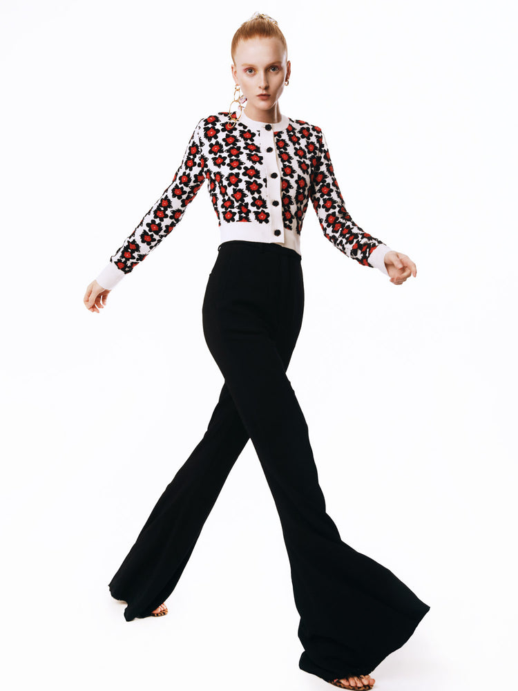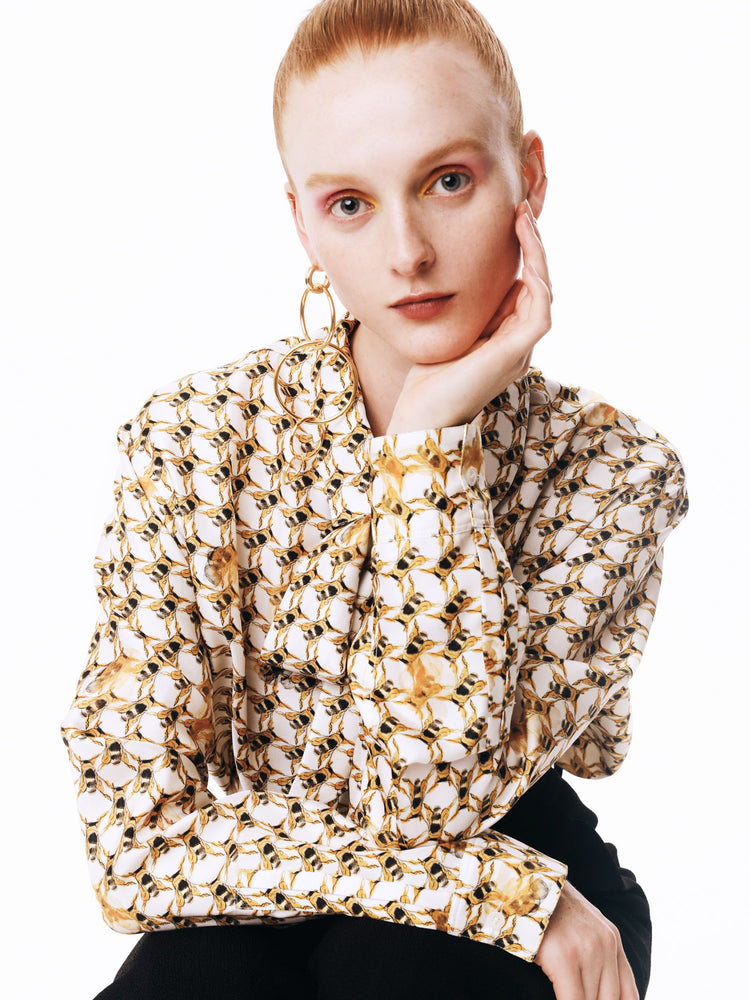 Perennially the anchor of my collections, floral prints took on a new dimension for Spring 2022. Influenced  by the saturated hues of the Hanging Gardens of Babylon and the enchanting habitat of the koi pond at the Brooklyn Botanical Gardens, I wanted to capture the depth and diversity of life that exists beyond surface blooms. A Bug’s Life is a print developed on this premise, depicting vibrant flowers enriched with ladybugs and caterpillars crawling through them. The koi pond motif is expressed through an intense jacquard woven into a dress, a top and skirt. What appears to be a houndstooth print at first glance is actually bumblebees set against a honeycomb pattern.