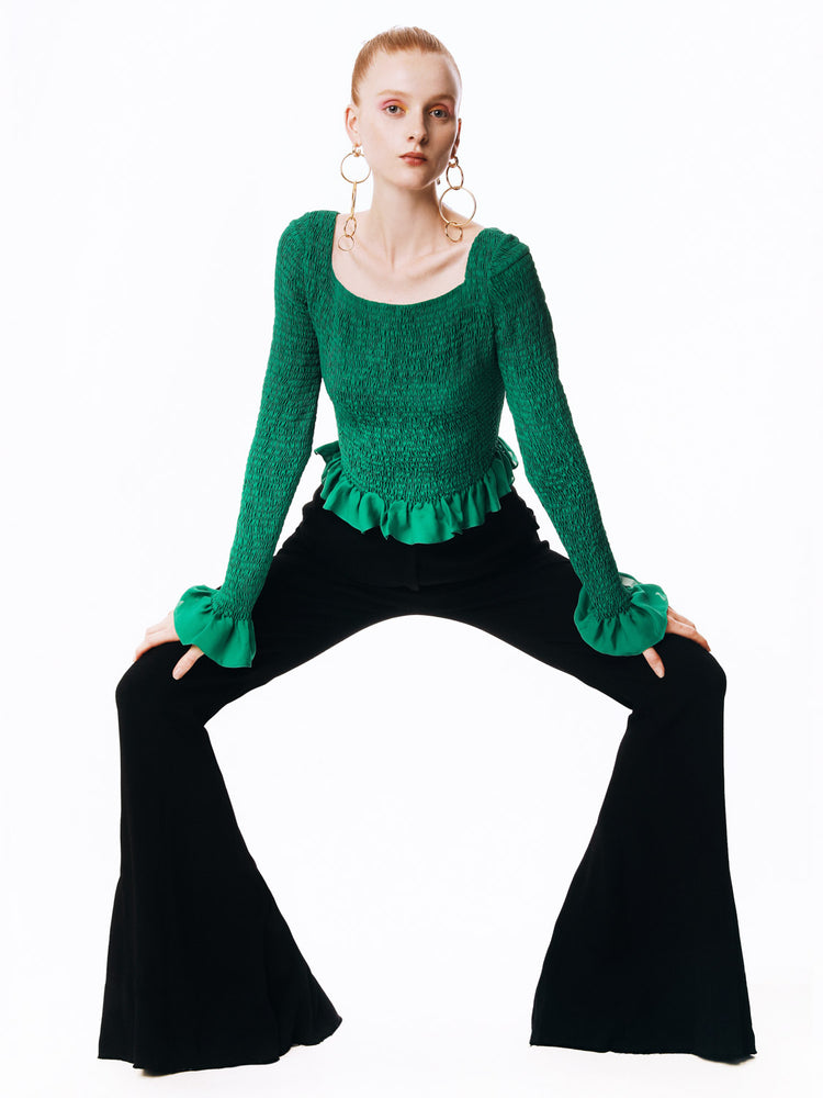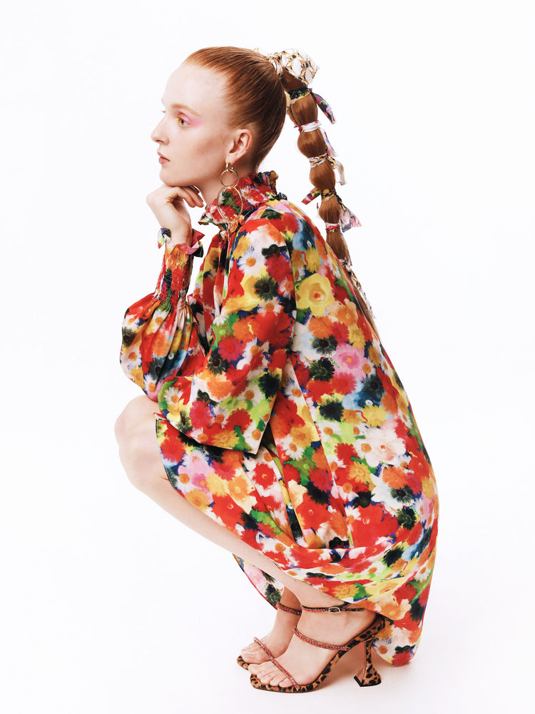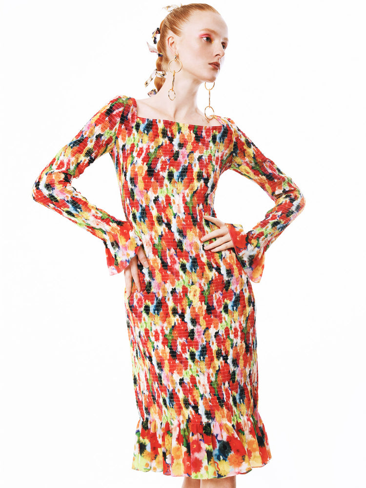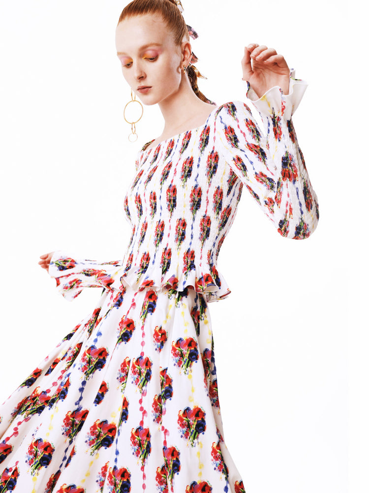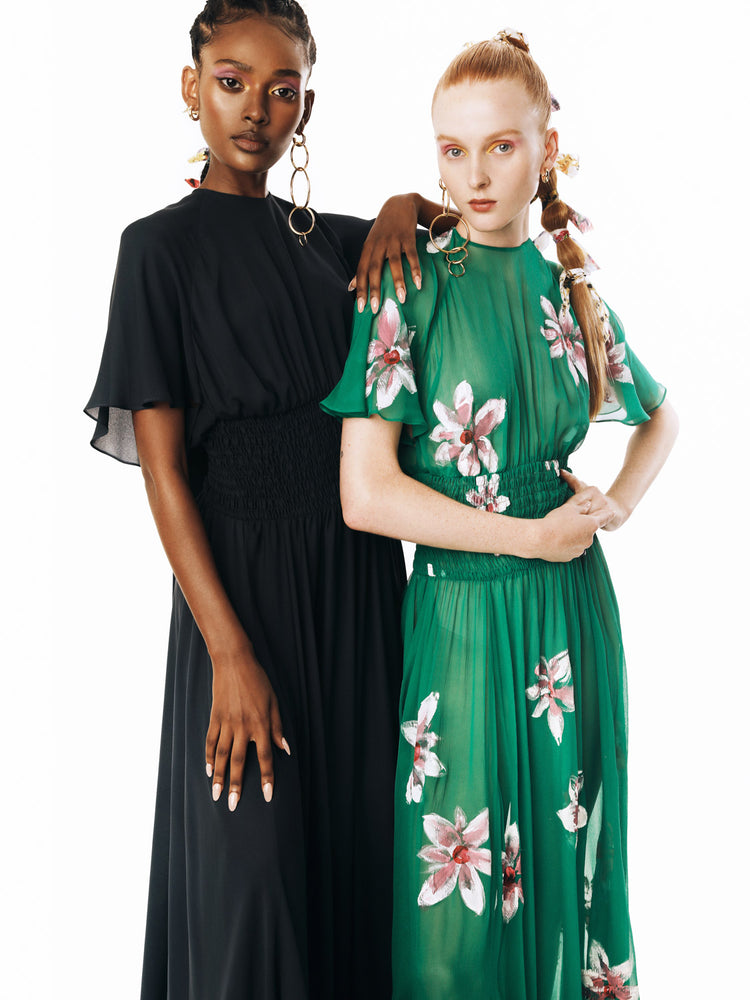 Our sustainable practices continue to evolve. The creative utilization of fabric scraps has been a brand tenet for several seasons. This time, we covered crystals in excess fabric and used them for large-scale embroideries. Hair-ties were made of pieces that otherwise would be left on the cutting room floor and several of our signature smocked pieces are crafted from patchworks of remnants